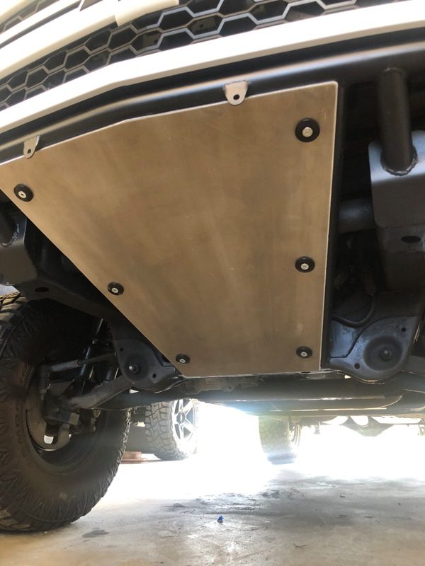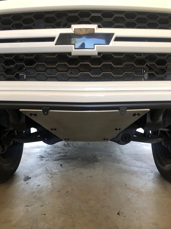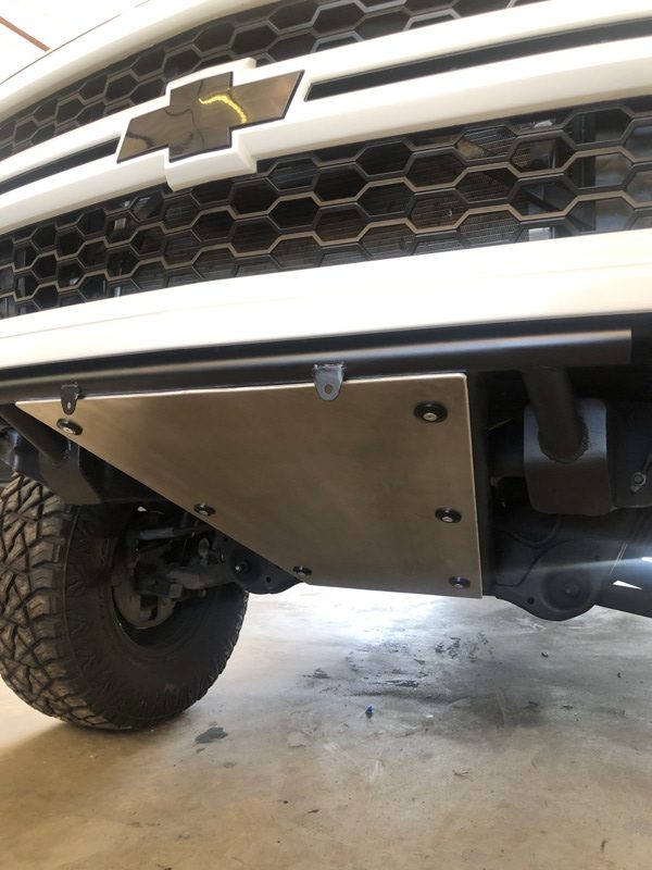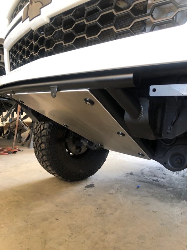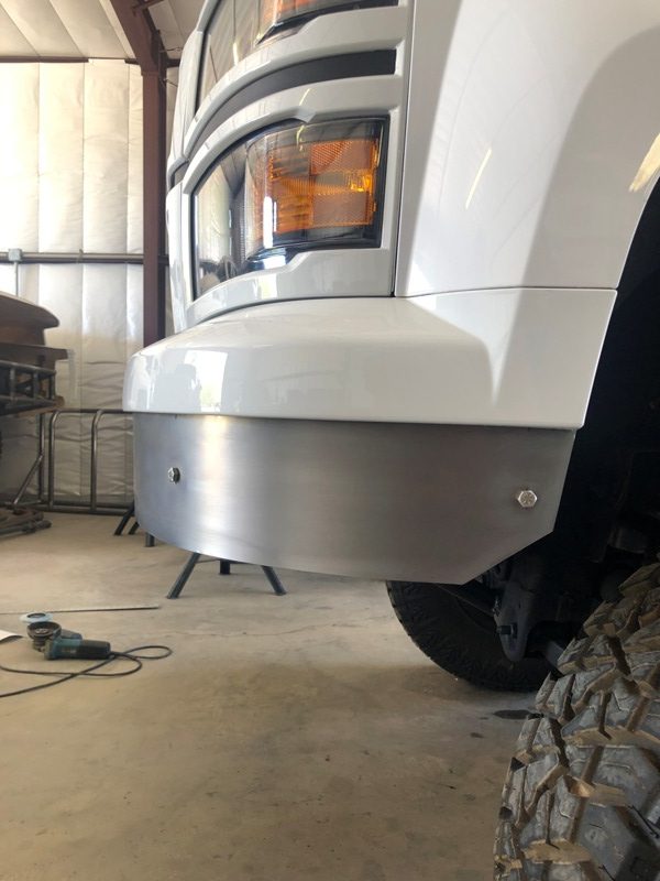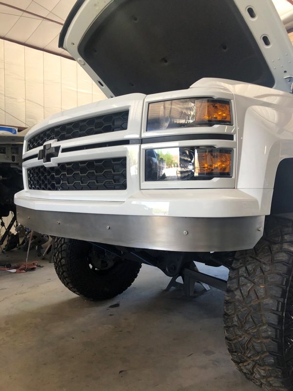 Here is one of our valance style bumpers. For this truck we built a complete prerunner bumper, but set back enough to allow for the valance. Then we built mounts to secure the valance. These valances are typically made from 3/16 ABS plastic, but in this case, we used 20 gauge sheetmetal. Fished off with Line X and billet hardware.